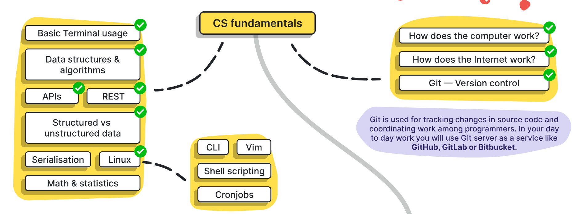 - 자료구조, 인터넷 구조(TCP-IP 및 HTTP 프로토콜?), OS 기초, 리눅스 기초 등...