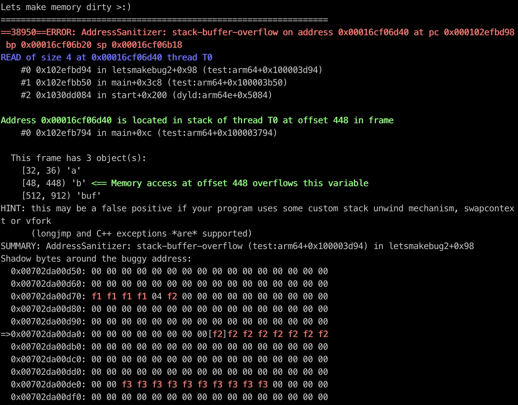 address sanitizer을 사용하면 잘못된 지역에 값을 덮어씌우는 시점에 바로 프로그램이 멈추면서 추가로 디버그 정보까지 보여줍니다.