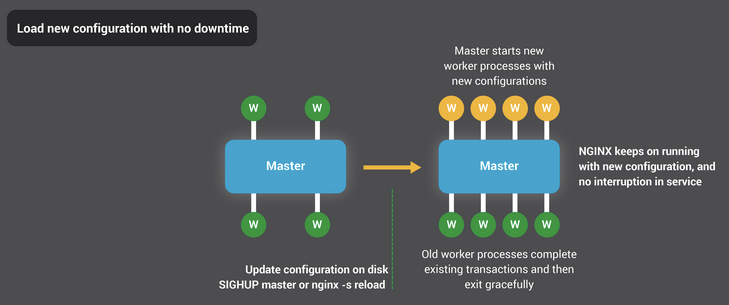 Configuration 경우에는, SIGHUP 신호를 받을 경우 Master process는 새로운 설정을 읽어들이고, 이 설정을 토대로 새로운 Worker (process) set을 만든다고 합니다. 기존 워커 프로세스들의 작업이 모두 끝나면, 완벽하게 새로운 설정을 포함하는 워커 셋으로 바꿔치기 되는 구조입니다.