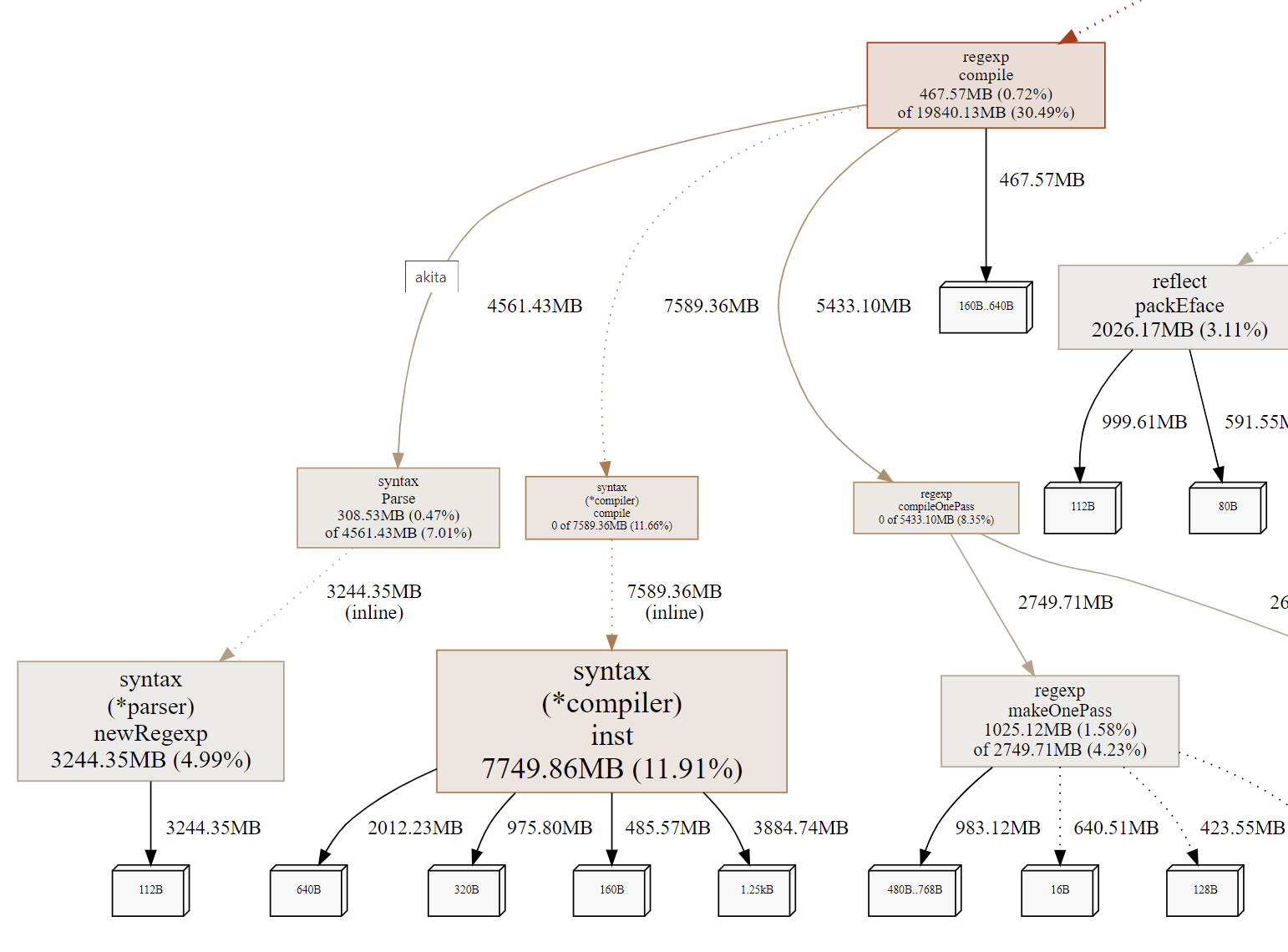 heap profile 중, regexp.compile 객체에서 거진 30% 가까운 메모리 할당을 보여주고 있었습니다. 우리는 데이터 포멧을 확인하기 위해 정규식을 사용하곤 하는데, 그 안에서 매번마다 정규식을 컴파일하고 있었습니다.