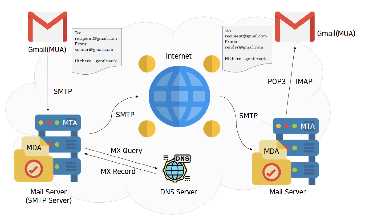 4. 수신자의 서버에서 전달받은 SMTP 프로토콜을 적절하게 잘 처리하여, 상대방이 메일을 확인할 수 있게 된다