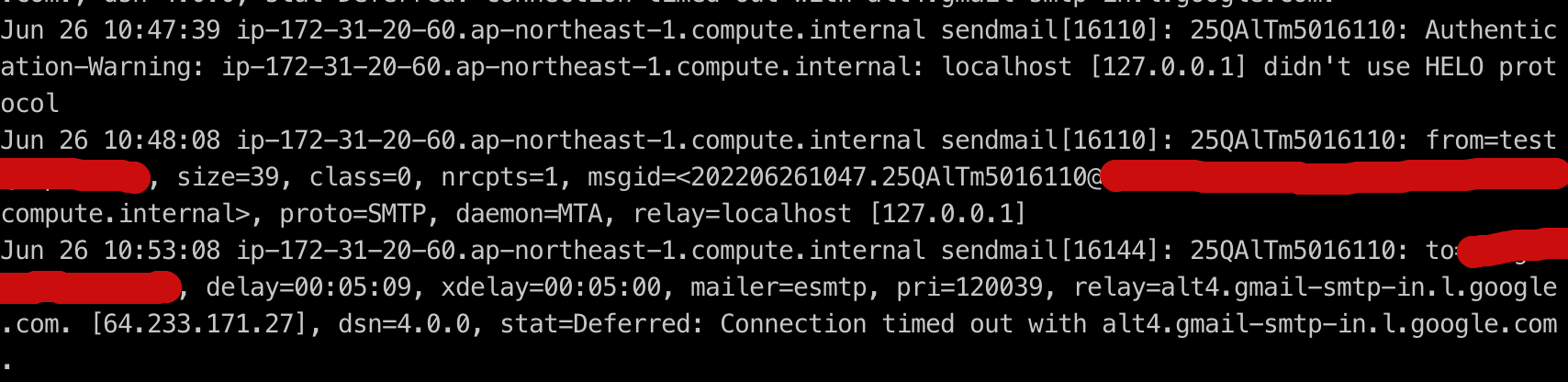 테스크탑에선 접속이 잘 되는데, AWS EC2 에서는 접속이 안 됩니다. 범인 발견! AWS에서 SMTP 프로토콜 사용을 막고 있던 것이었습니다. 25번 포트를 쓰려면 별도로 인가를 받아야 하는데, 스팸 방지를 위해 막은 것으로 보여, 대책없이 포트를 뚫어달라고 하는 것은 아무래도 좋은 방법이 아닌 것 같습니다.