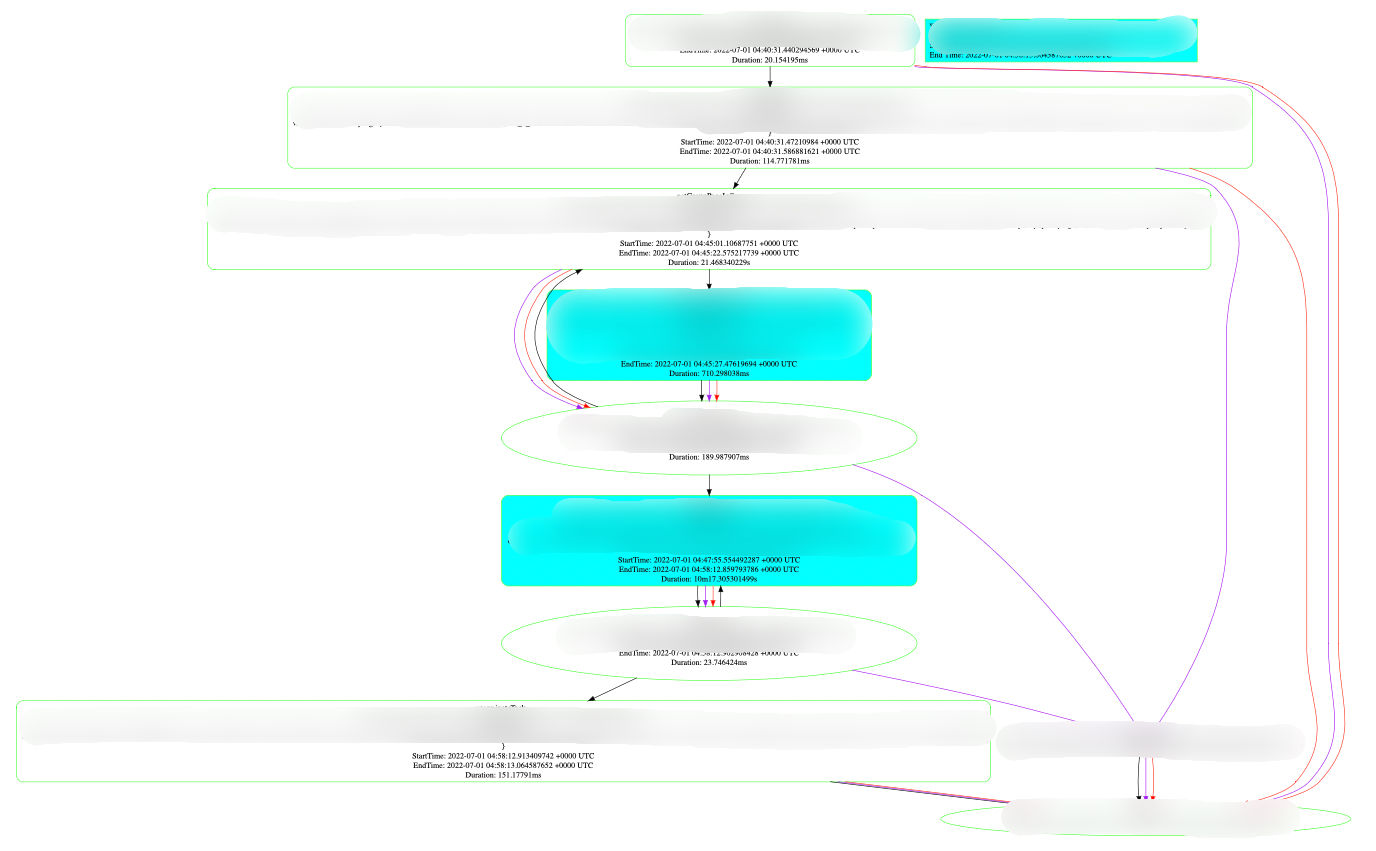 저희 회사에서도 Workflow에 API를 붙이는 방식으로 분산 추적을 할 수 있는 툴을 만들어서 사용하고 있습니다. 배치 작업보다는 실시간으로 데이터를 처리하는 구조에 맞는 분산 추적 툴이 필요하였기에, 기존의 툴을 사용하는 대신 AWS SQS로 파이프라인을 구축하여 워크플로우 로깅과 트레이싱을 동시에 할 수 있도록 정보를 남기는 독자적인 프레임워크를 만들고, 이를 시각화하여 확인할 수 있는 웹 서비스를 만들어서 사내에서 사용중에 있습니다.