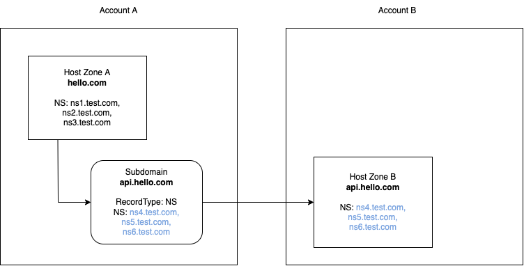 - A 계정에서 루트 도메인에 대해서 호스팅 존을 만들고, 거기에서 서브도메인을 만든다.