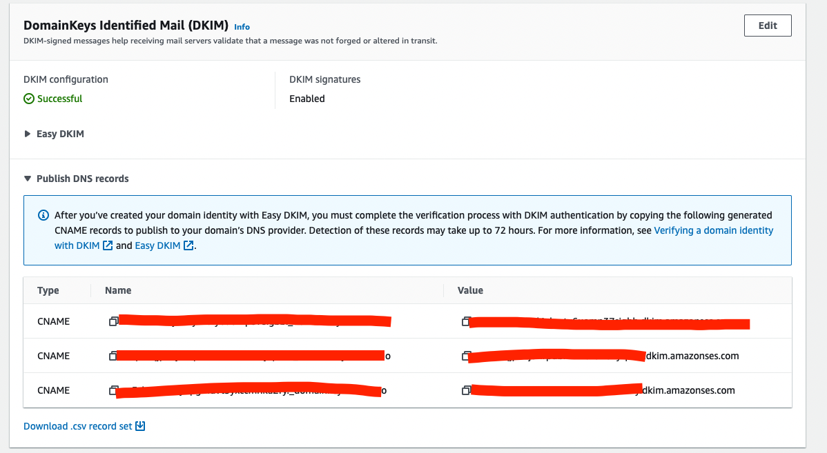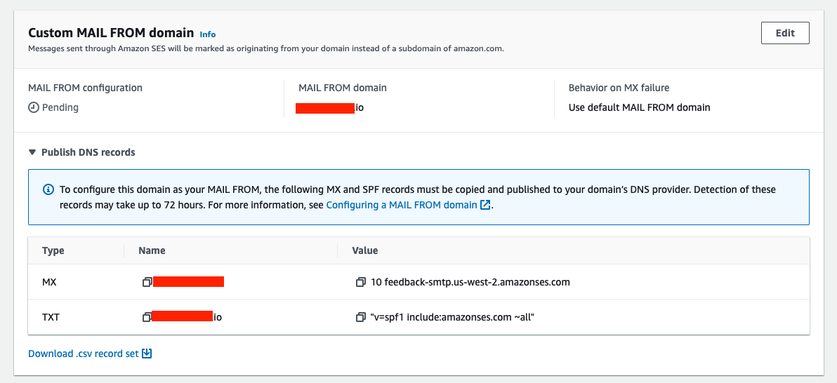 심지어 MAIL FROM 도메인 세팅을 위한 값도 자동으로 보여주고, 버튼 한번 클릭하면 Route53 호스팅에 알아서 추가해준다! 편해도 너무 편함. 이러니 AWS 서비스 한번 쓰면 못 벗어나는게 아닐까….