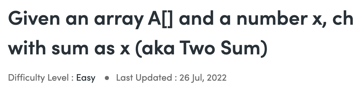 해시로 풀 수도 있다. for loop을 한번 돌리는데, 돌면서 Hash[sum-A[i]] 에 해당하는 값이 있는지 찾아본다. 없으면 Hash[A[i]] 를 저장한다.