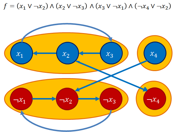 재미있는 것은 해당 문제가 그래프 문제로 치환된다는 점입니다. 그리고 이를 위해 SAT 절을 명제로 치환하는 과정을 필요로 합니다. 예시를 하나 들면, (A v B) 는 !A => B, !B => A 가 필요조건에 대한 명제가 됩니다. 이렇게 끌어낸 명제들을 가지고 X_a ⇒ !X_a 꼴로 가는 그래프를 만들 수 있습니다. 그리고 해당 그래프에서 SCC(Strongly connected component; 어떠한 정점에도 도달 가능한 연결 형태)를 찾는 것이 핵심입니다. 왜냐면 SCC 안의 명제 중에 참/거짓을 동시에 만족해야 하는 (e.g. X1 ⇒ !X1) 꼴의 명제가 있다면, 해당 명제는 참이 될 수 없다는 것을 알 수 있기 때문입니다.