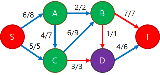 - 포드-폴커슨: 널리 알려져있고 간단한 편, 시간 복잡도가 최대유량에 비례하는 특징이 있어 한계가 있음!!