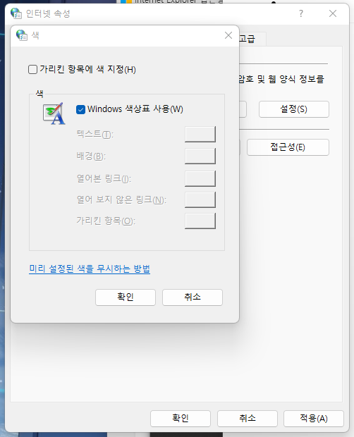 2. 인터넷 속성 창에서, "색" > "미리 설정된 색을 무시하는 방법" 클릭한다.