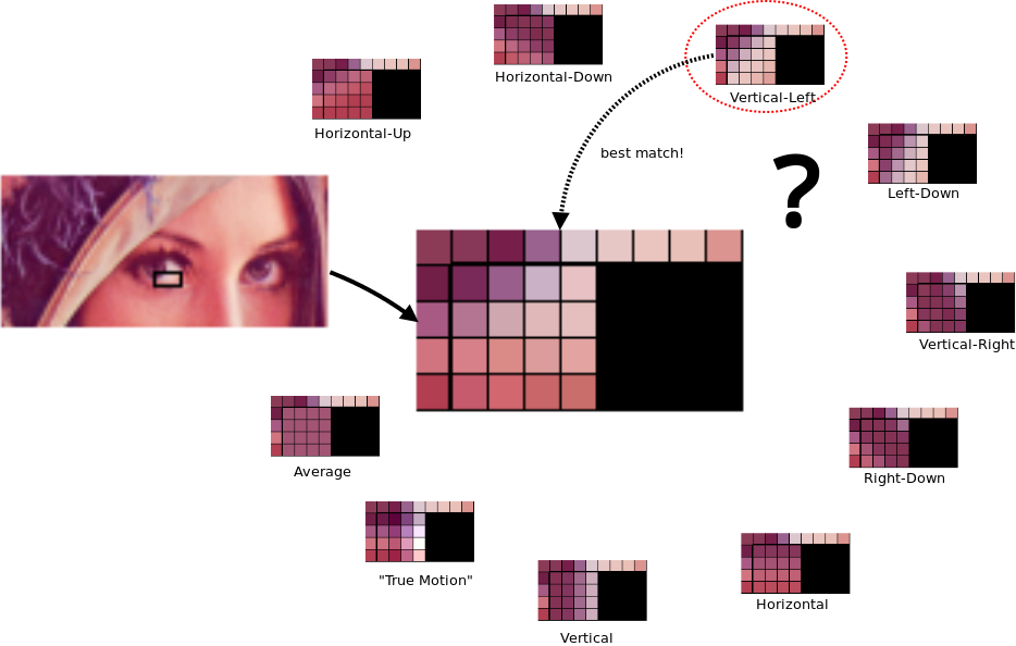 ์ด๋ฏธ์ง ์์ฒด๋ฅผ ๊ตฌ์ฑ(Intra)ํ ๋๋ ํฌ๊ฒ 4๊ฐ์ง ์ ๋ต์ด ์ฌ์ฉ๋๋ค๊ณ ํฉ๋๋ค.(H, V, DC, TM). ์ฌ๊ธฐ์ TM_PRED ๊ฐ ํน์ดํ๋ฐ, ๋๊ฐ์ ๋ฐฉํฅ์ ํฝ์