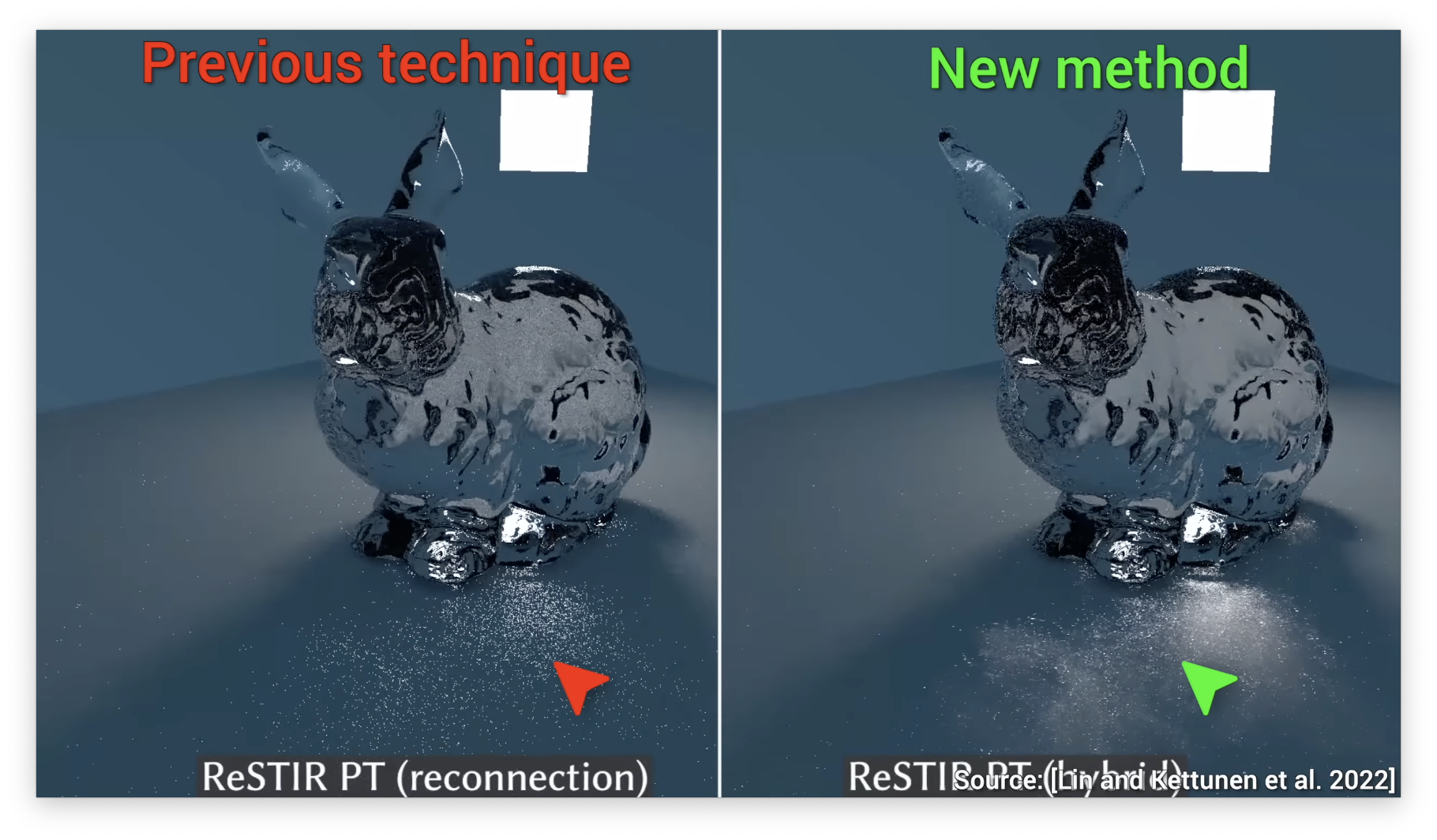 앞선 기술들로 인해서 이제 꽤 정교한 레이 트레이싱이 가능하게 되었습니다. 하지만 여전히 실시간으로 극도로 정교한 레이트레이싱을 하기에는 제약 사항들이 꽤 많습니다. 다시 처음으로 돌아가 생각해보면, 레이 트레이싱은 시간과 노이즈와의 싸움이었습니다. 노이즈 없는 이미지를 만들기 위해서는 여전히 무시무시한 연산량이 필요할 것입니다. 물론 위 기술들과 하드웨어 발전 덕분에, Unbiased 이미지도 이전보다 꽤 적은 노이즈를 가지고 만들 수 있을 것입니다.