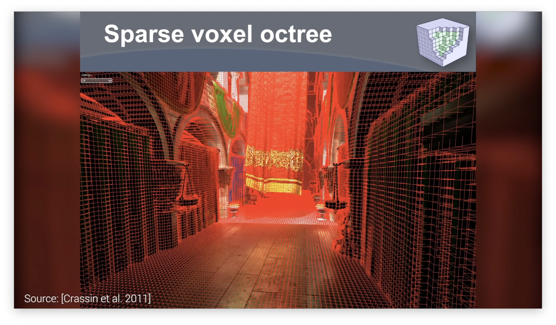 그래서 다른 대안으로, 광선 자체의 연산량을 줄이는 방향으로 접근 방식을 바꿉니다. 공간을 Voxel 이라는 단위로 양자화하고, 반사 횟수에 제한을 두는 것입니다. 이 기법이 무려 10년 전의 방식인데, 다소 편향(Biased) 된 결과물을 보여주지만 보편적으로 아주 깔끔한 이미지가 나와서 사람들이 경악을 금치 못했던 기술입니다. 특정 조건에서는 지금 봐도 전혀 어색하지 않은 이미지가 나옵니다.