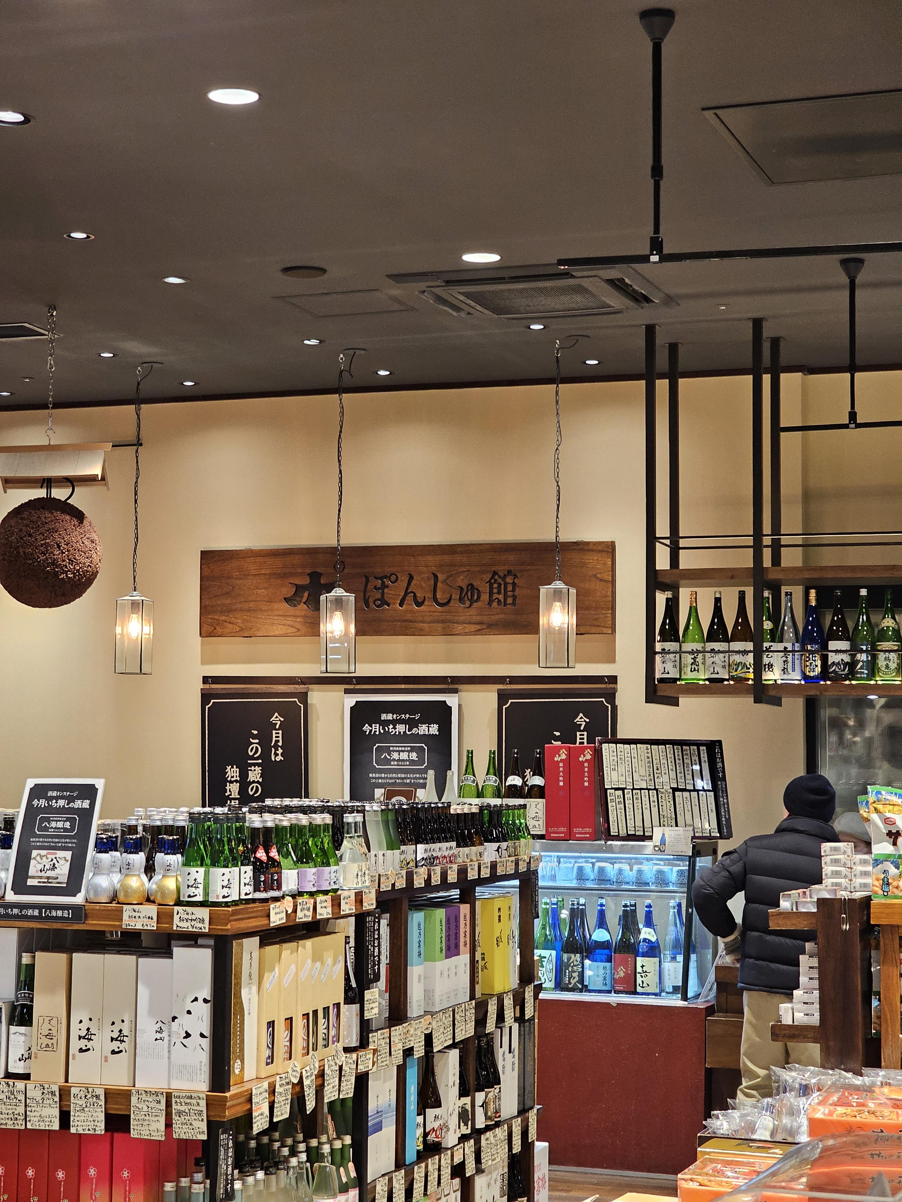 폰슈칸 특유의 로고가 보이고 술들도 잔뜩 있다. 저기 아래 보이는 팔각산이랑 하치하치였나 사케 꽤 맛있더라.