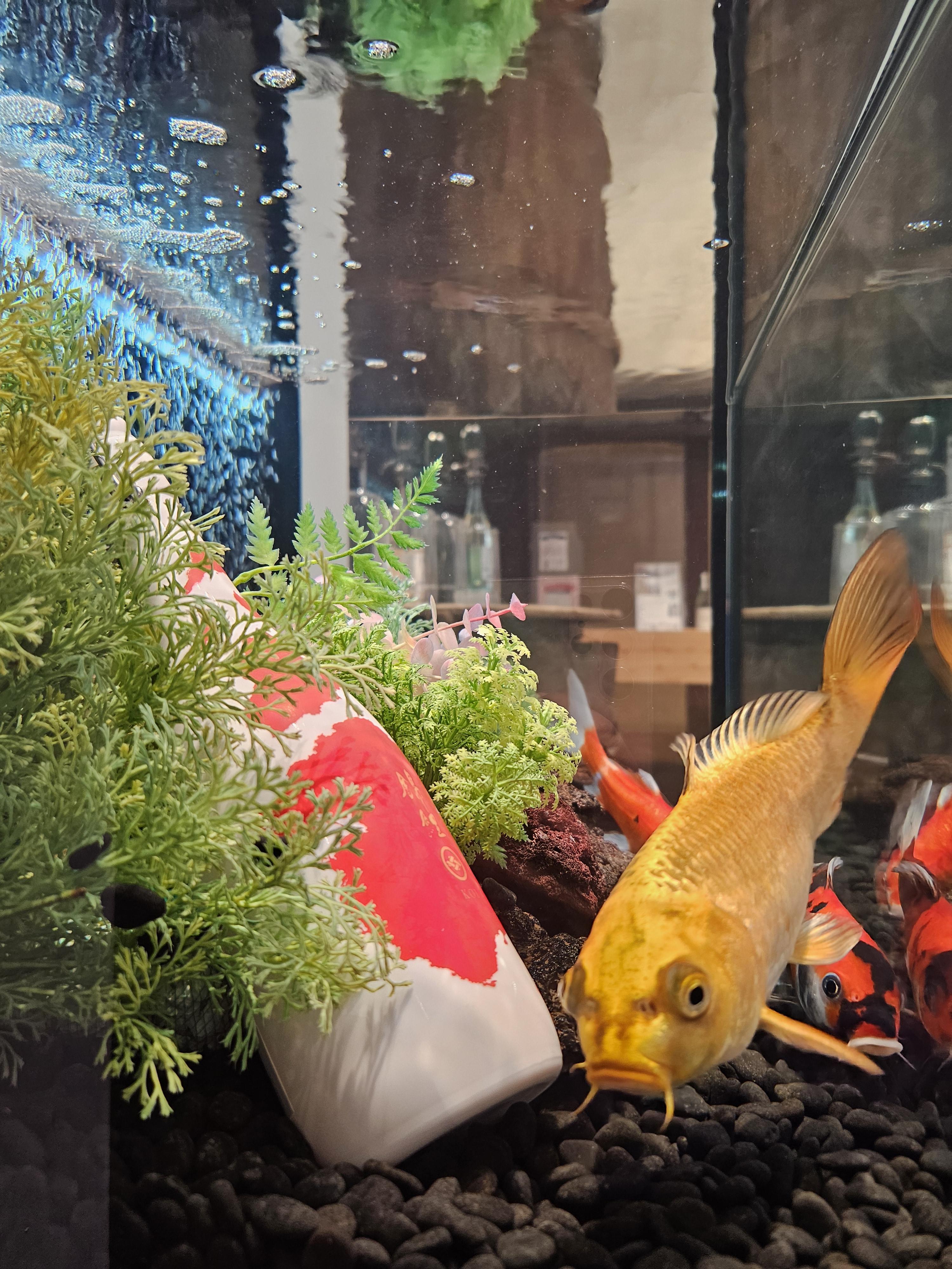 컨셉에 맞게 옆에 어항에 잉어사케 병과 잉어도 잘 놓아 두었다. 프리미엄 시음존 가야 있음.