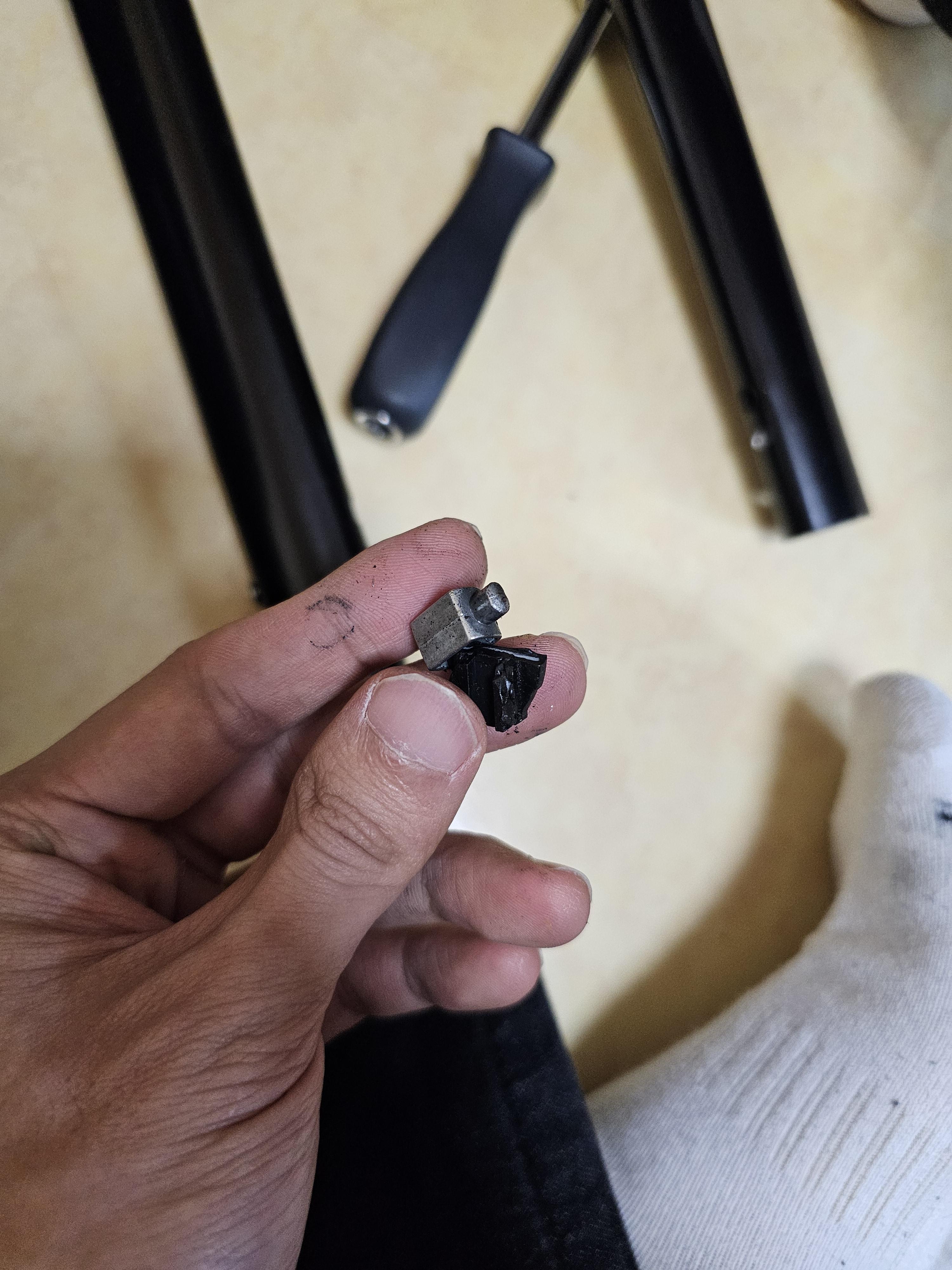 핸들바 안쪽 쇠기둥을 뽑고 탈탈 털어보니 뭔가 부품이 떨어져 나온다. 플라스틱 파츠는 부러진 것으로 보이니 순접으로 붙이면 될 것 같고, 무언가 보이는 쇳덩어리는 핸들바를 고정시켜주는 부품임에 틀림없다.