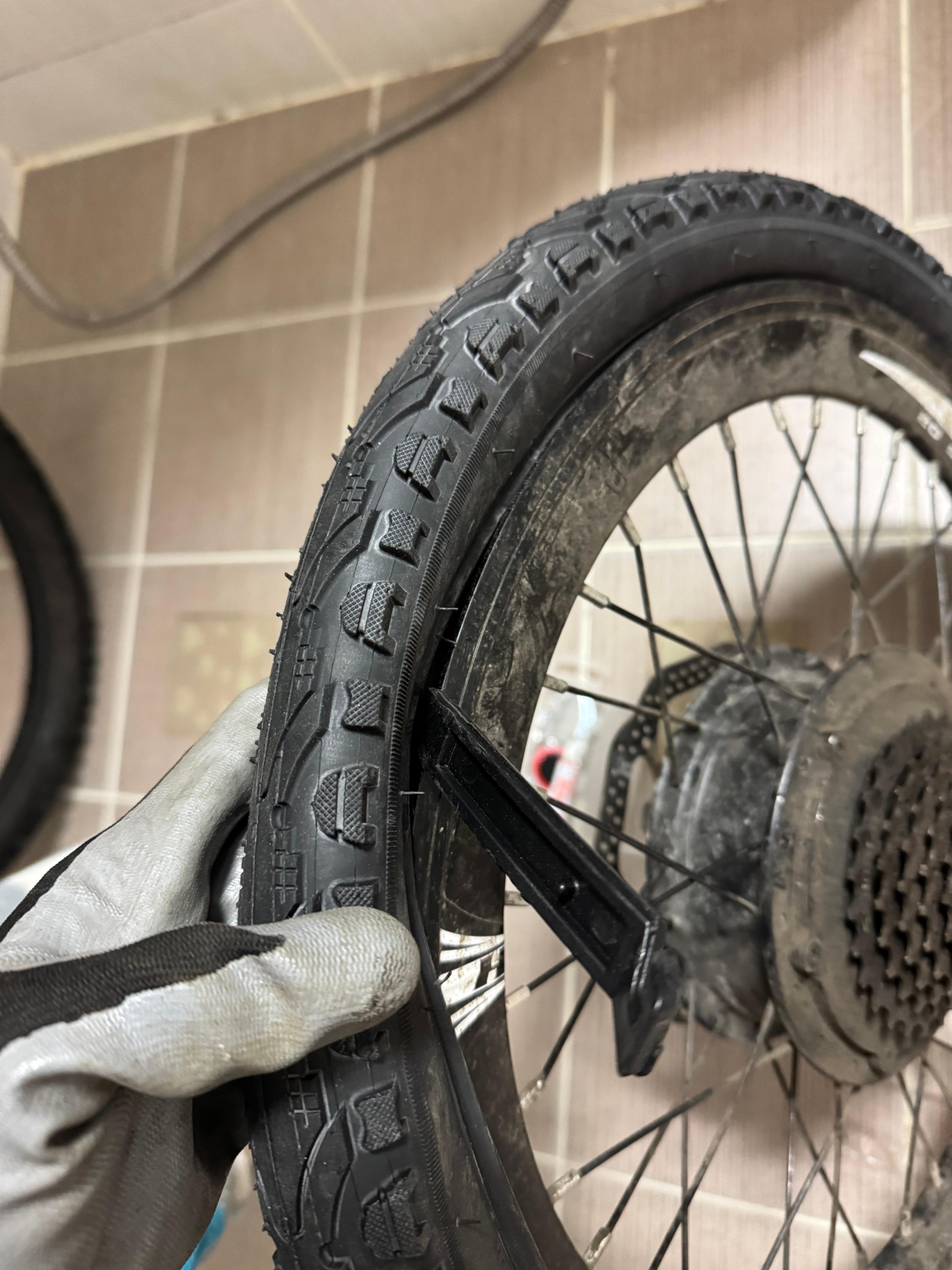 타이어가 새거라서 그런지 굉장히 빳빳하다. 이 때 타이어 주걱을 잘 써서 림 안으로 꾹꾹 밀어넣는 것이 중요하다. 사이드월 아래쪽을 꾹꾹 누르다 보면 안으로 어찌저찌 잘 들어간다. 여기는 힘과 테크닉, 그리고 근성이다.