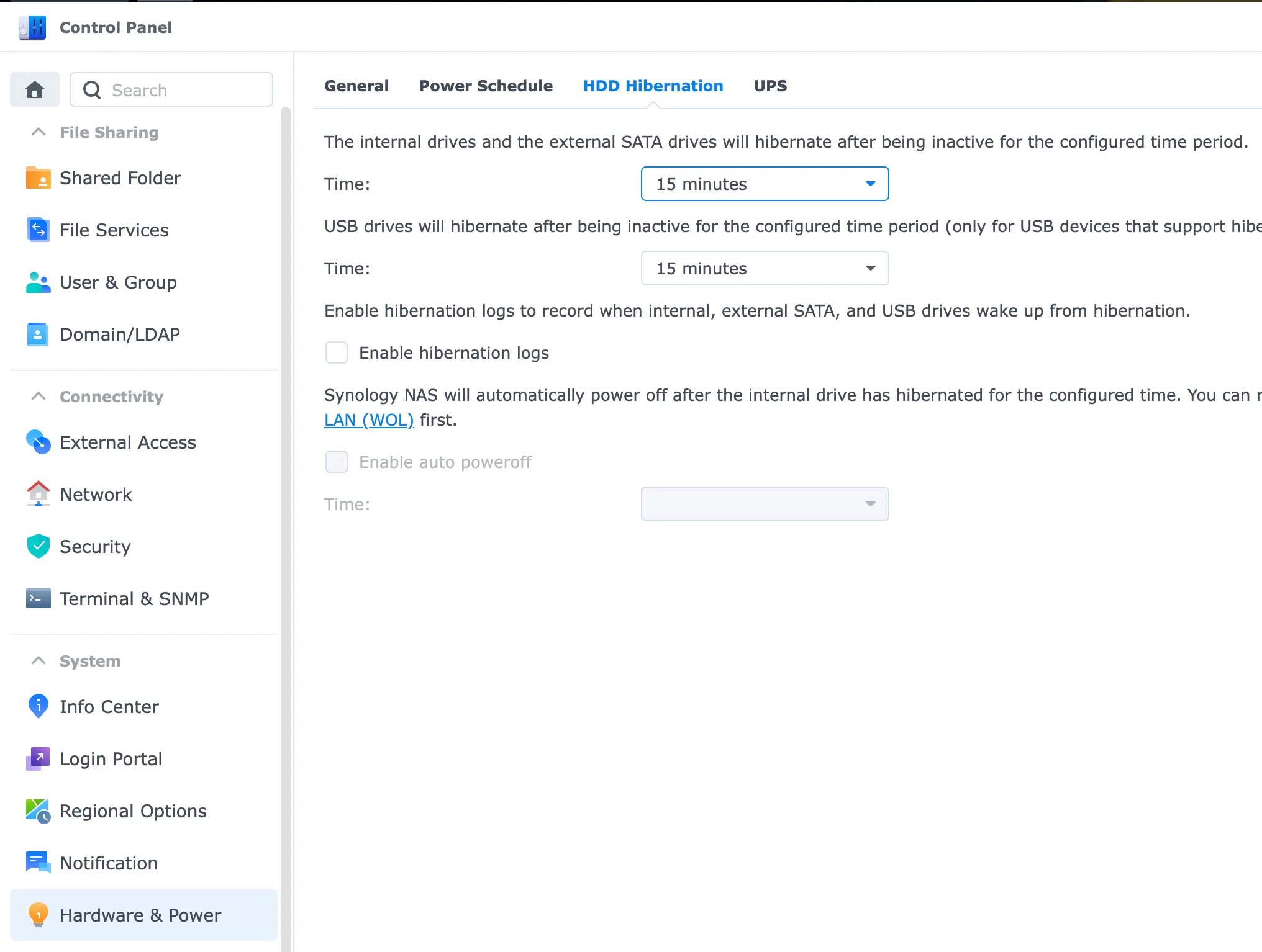 이제 헤놀로지에서 외장 하드 절전모드 설정 또한 해줬다. 개인용도로 쓸 DAS이기에 전력을 아끼고 하드를 오래 사용하기 위해서는 가급적 사용하지 않을 때 하드를 끄는 기능은 필수불가결이다. 다만 DAS 자체에서 파워 절전 기능이 있으니 안해줘도 되지 않나 싶은 의문이 들었지만, 그래도 해주는 쪽이 더 나을 것이라 생각했다.