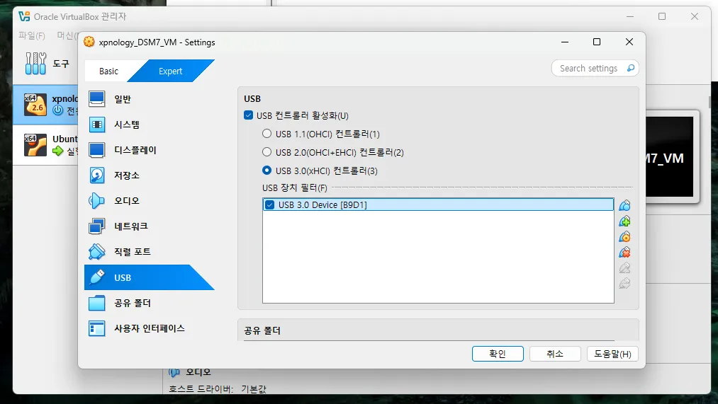 외장으로 물린 HDD를 VBox에 passthrough 시켜서 인식시켜준다. 여기서 USB는 최적의 속도를 위해 3.0을 선택해 놓았다.