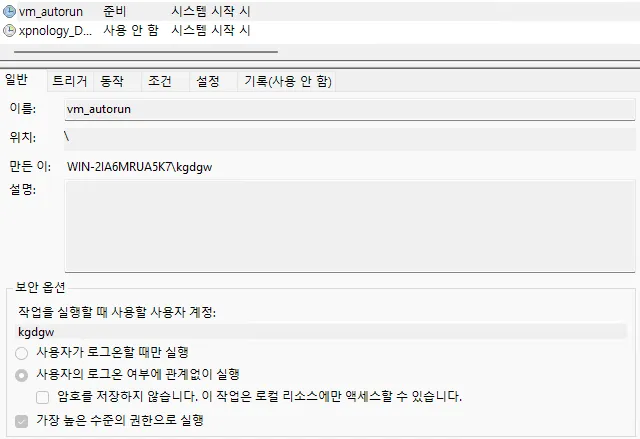 이제 해당 스크립트를 컴퓨터 부트 시 자동 실행되도록 하면 완벽할 듯 하다. [작업 스케쥴러]에 들어가서 적당히 아래와 같이 시스템 시작 시 실행되도록 하면, 윈도우를 켜기만 해도 vm이 자동으로 무조건 돌아가게 될 것이다.