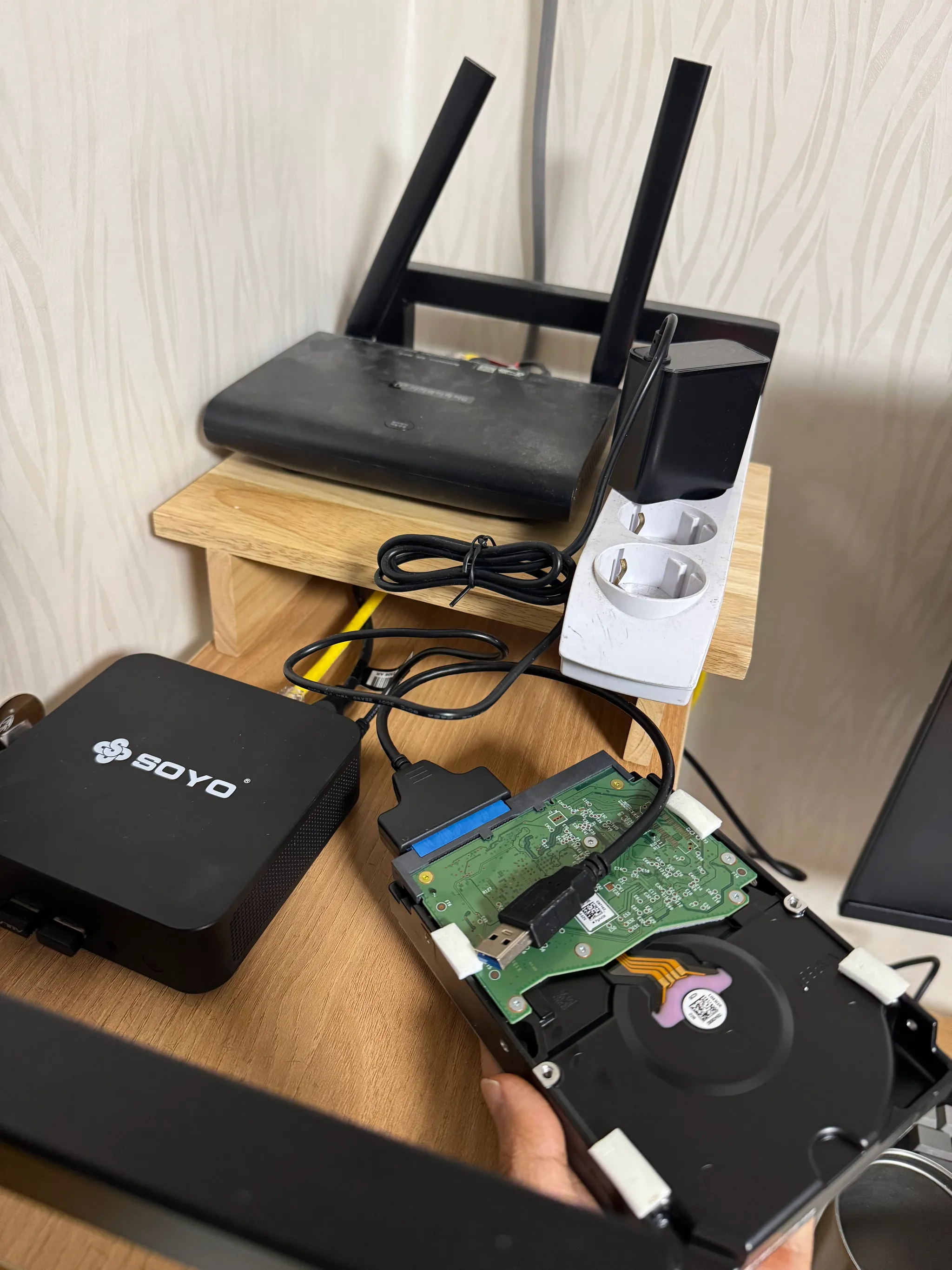 SATA to USB + 전원단자- 3.5” 하드의 경우 추가 전원 없으면 하드 구동 안 되니 주의. 하드 돌만한 전력이 미니PC의 USB에서 안 나옴.