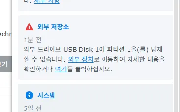 이제 헤놀로지에서 인식이 되나 확인해보자. 인식한다! 야호! 하지만 사용할 수 없는데, 하드디스크가 포멧되어 있지 않기 때문이다.
