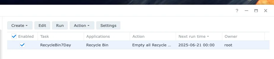 추가로 휴지통에 파일이 은근 쌓이는 관계로 7일 된 것들 영구삭제하도록 작업 스케쥴러에 하나 추가해줬다. 이 정도면 관리 자동화는 끝.