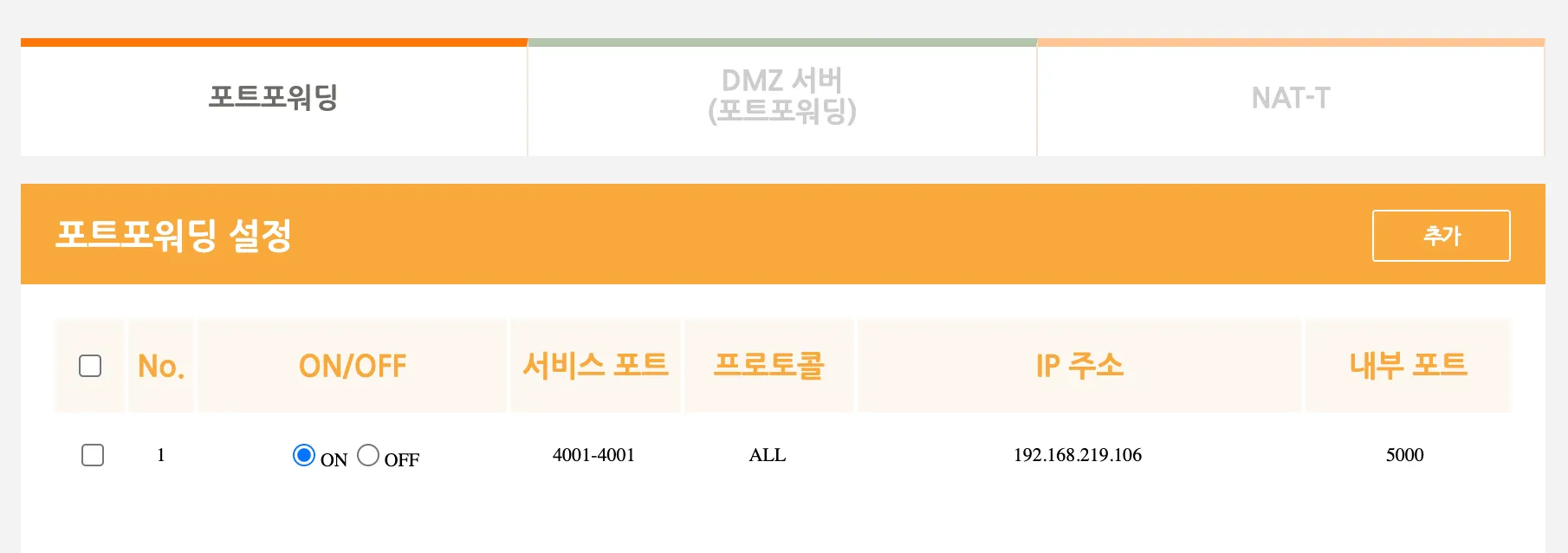 DMZ를 굳이 하지 않은 이유는, 특정 서버가 공유기의 모든 포트를 독점하는 것에 대한 거부감이 있는 것도 있지만, 포트를 많이 개방하는 만큼 외부 공격에 취약해지는 문제가 있어서이기도 했다.