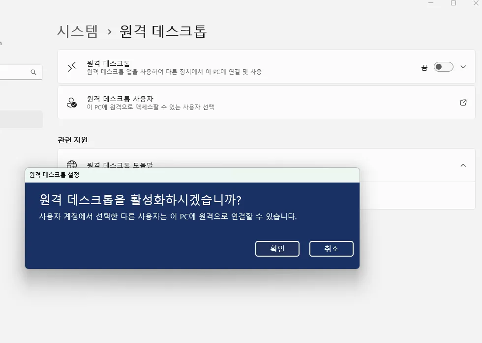 시작메뉴에서 “원격제어” 접속하여 나오는 설정 들어간 후…