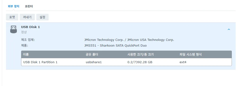 현재 구성은 DAS를 Synology에서 USB 외장 저장소로 인식하고 있기 때문에 몇 가지 제약 사항들이 있는데, S.M.A.R.T 기능(베드섹터 탐지 등) 및 로컬 저장소에서만 지원되는 기능 (Synology Sharesync 라던가) 같은 것들이 되지 않는다. 이 점은 꼭 염두에 두어야 할 듯.