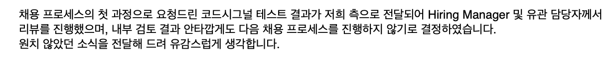 다소 당황스러운 점은 "채용 매니저 및 유관 담당자"가 검토를 하였다고 메시지를 주었다는 것인데, 내 입장에서 제출한 결과물에 대하여 이런 평가를 받는다는 것은 회사의 채용 및 유관 담당자(아마 회사)가 나와는 다른 개발 철학을 가지고 있다는 뜻으로밖에 해석이 어렵다. 혹은 아마도, 송구스러운 소식을 부드럽게 전달하고자 사용된 자동화된 메시지일 것이다. 아마 후자라고 생각하는데(또한 그렇게 믿고 싶다), 아쉽게도 no-reply 이메일로 전달받았기에 어떠한 질문도 물어 볼 수 없었다. 동시에 자동화된 메시지일 것이라는 확신을 더더욱 안겨주었다. 결과도 아쉽지만, 회사에 대해서 어떠한 소통을 해보기도 전에 프로세스가 끝나서 굉장히 아쉽다.