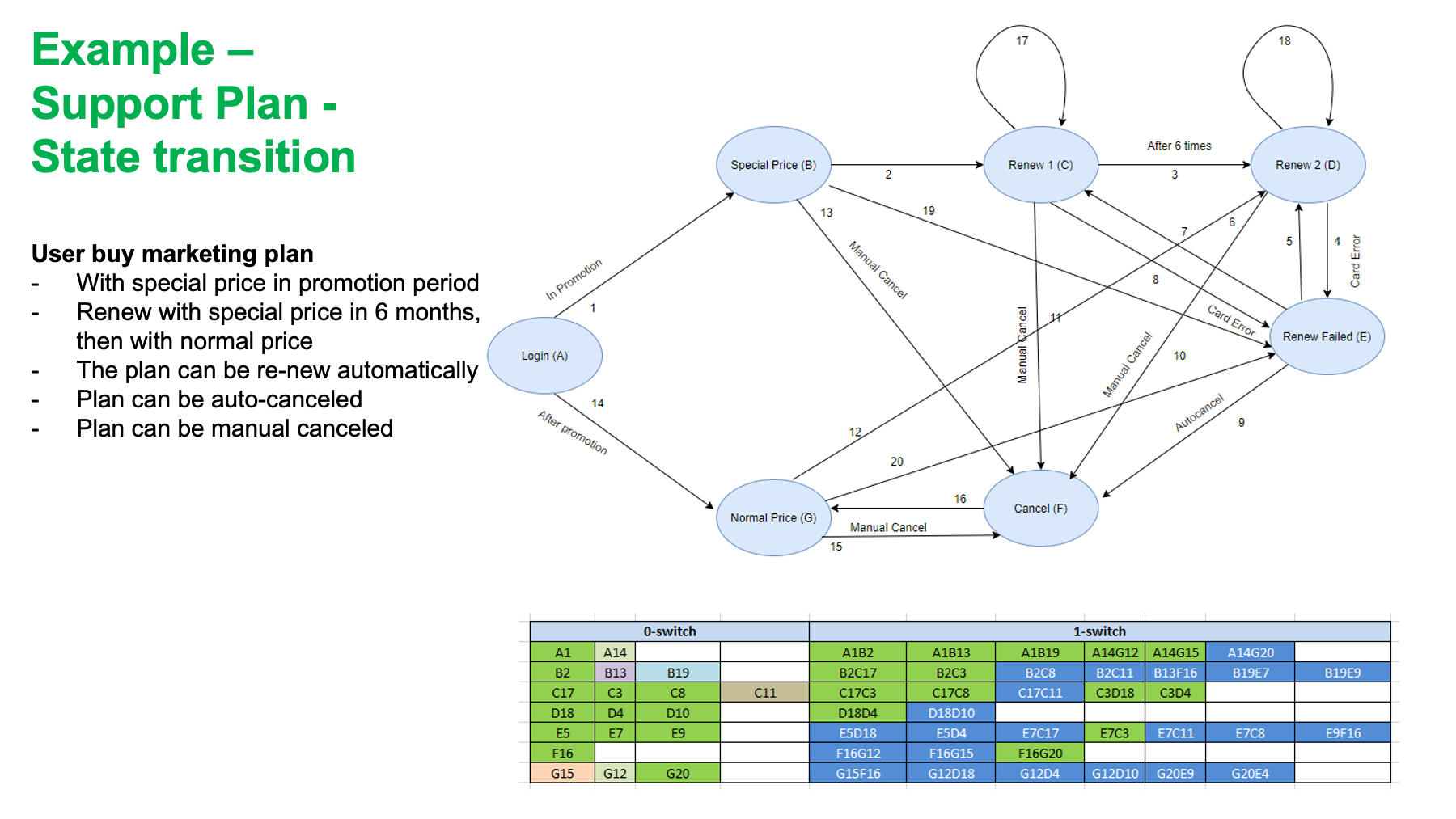 가능한 경우의 수가 많을 때 pairwise로 모든 경우를 커버할 수 있습니다. 다만 이 경우 과도하게 케이스가 많아질 수 있어서, 간단한 경우라면 EP-BVA로 테스트케이스 그룹화시켜 간략화 할 수 있습니다. - 상태 전이(state transition)을 통한 테스트 만들기