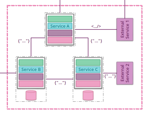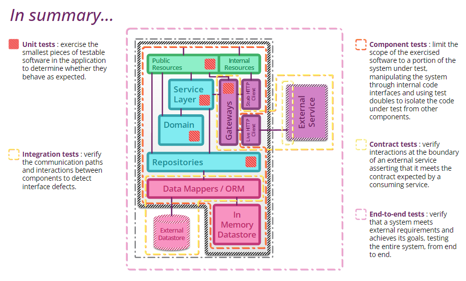 위의 아키텍쳐에서 볼 수 있듯이, 유닛 테스트와 통합 테스트 및 컴포넌트 테스트의 scope가 다른 것을 알 수 있다. end-to-end test는 이러한 서비스들이 여러개 엮여서 훨씬 더 거대해진다.