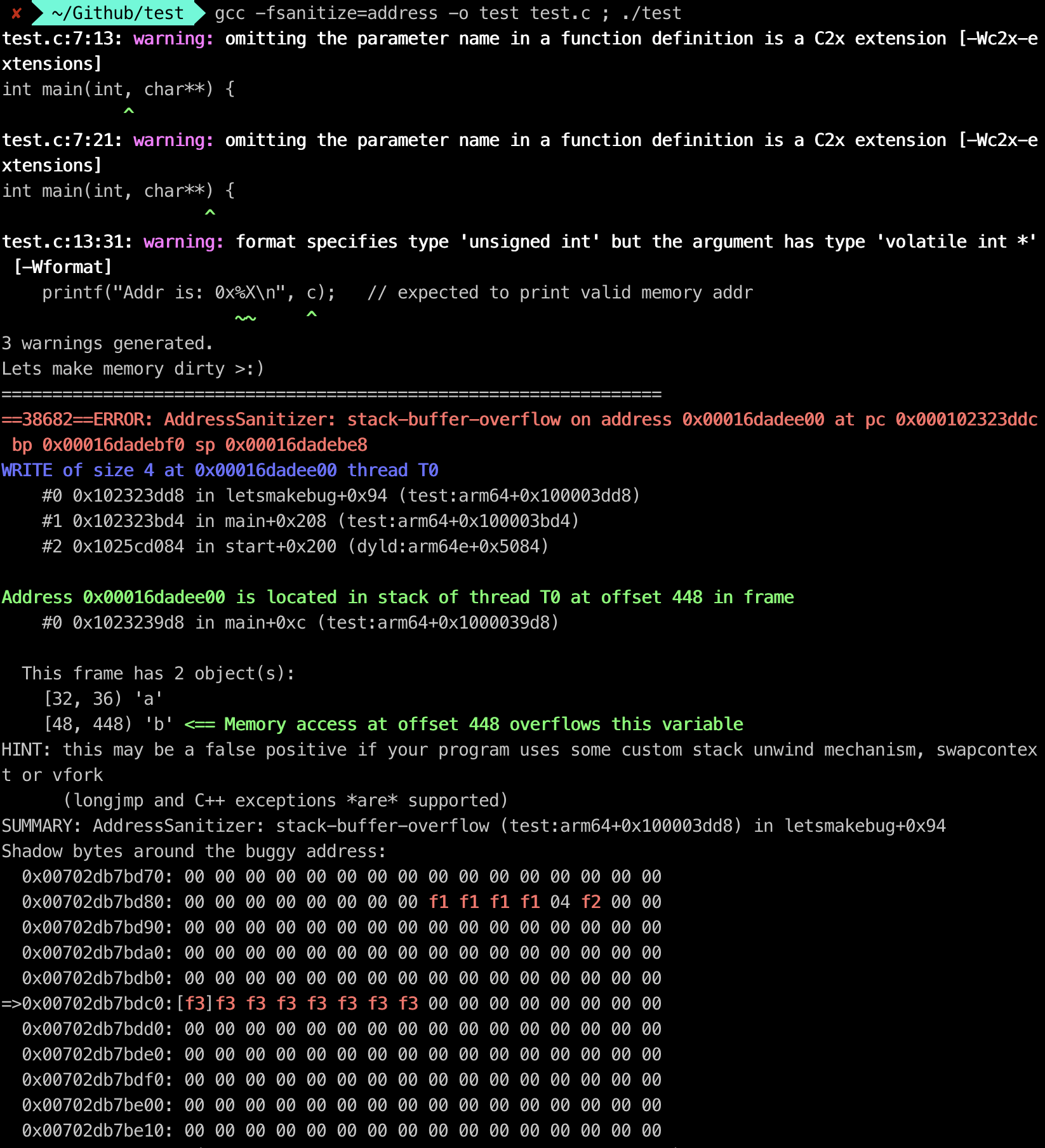 address sanitizer을 사용하면 잘못된 지역에 값을 덮어씌우는 시점에 바로 프로그램이 멈추면서 추가로 디버그 정보까지 보여줍니다.