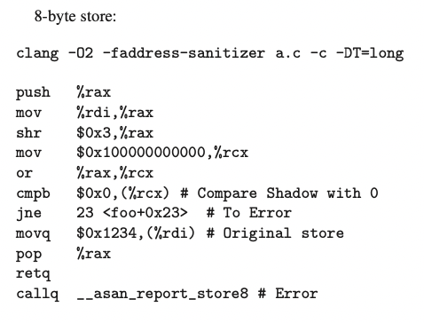 이쯤되니 실제로 어떻게 어셈블리가 만들어지는지가 궁금해졌습니다. 친절하게도 논문에서는 이에 대해서 상세히 설명해 주고 있는데, 아래와 같이 shadow byte를 그대로 compare한다고 씌여 있습니다. 뭐 실제로 그럴 것이겠고, 이러더라도 local cache나 branch prediction 등 덕분에 성능 하락이 그렇게 크지는 않을겁니다.
