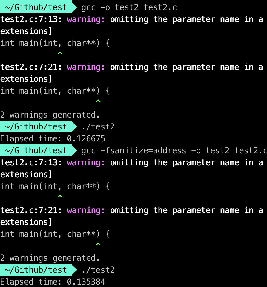 - -fsantizier=address : 런타임 시 메모리 참조를 검사하는 코드를 추가함. 계측되는 범위는 stack, malloc, code 등 다양합니다. C 최적화 수준과 상관없이 동작합니다. (-O3 과도 호환 가능)