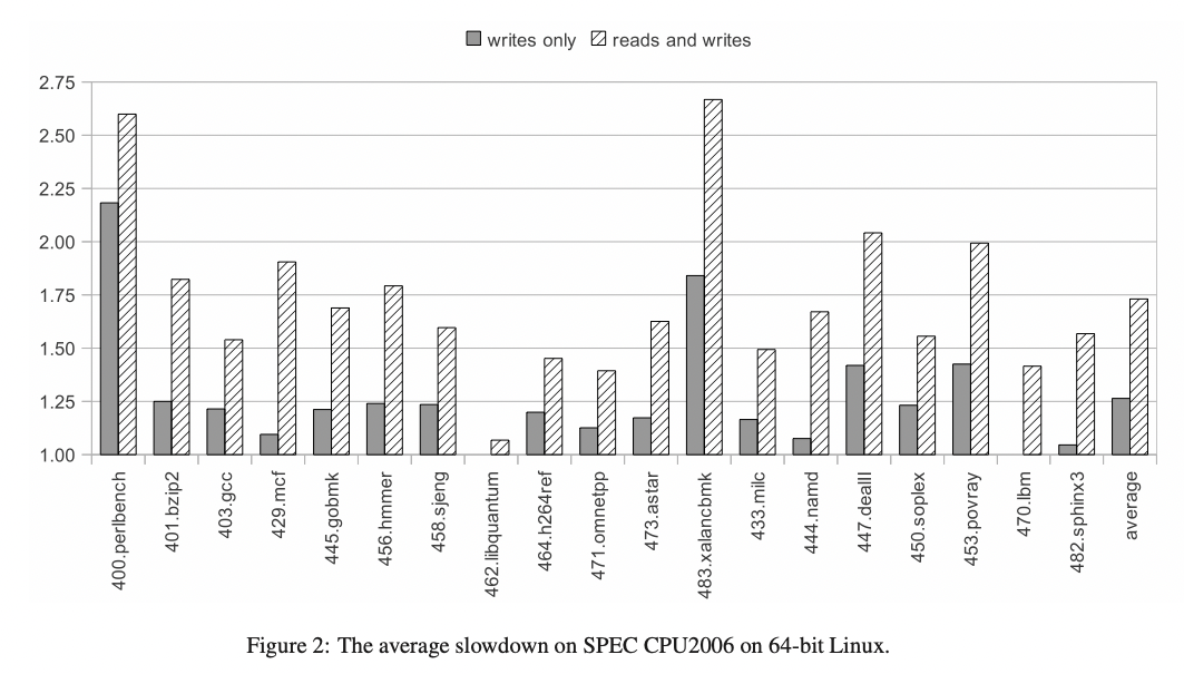 논문에서도 실험한 자료가 있어서 들고와 보았는데, READ ONLY의 경우에는 위에서 직접 실험한 것과 비슷한 수준의 slowdown이 나타난다고 되어 있습니다. 그런데 write 포함이면 좀 느리네요... 뭐 보통은 read를 많이 하니까 이 정도는 감안 가능할지도?