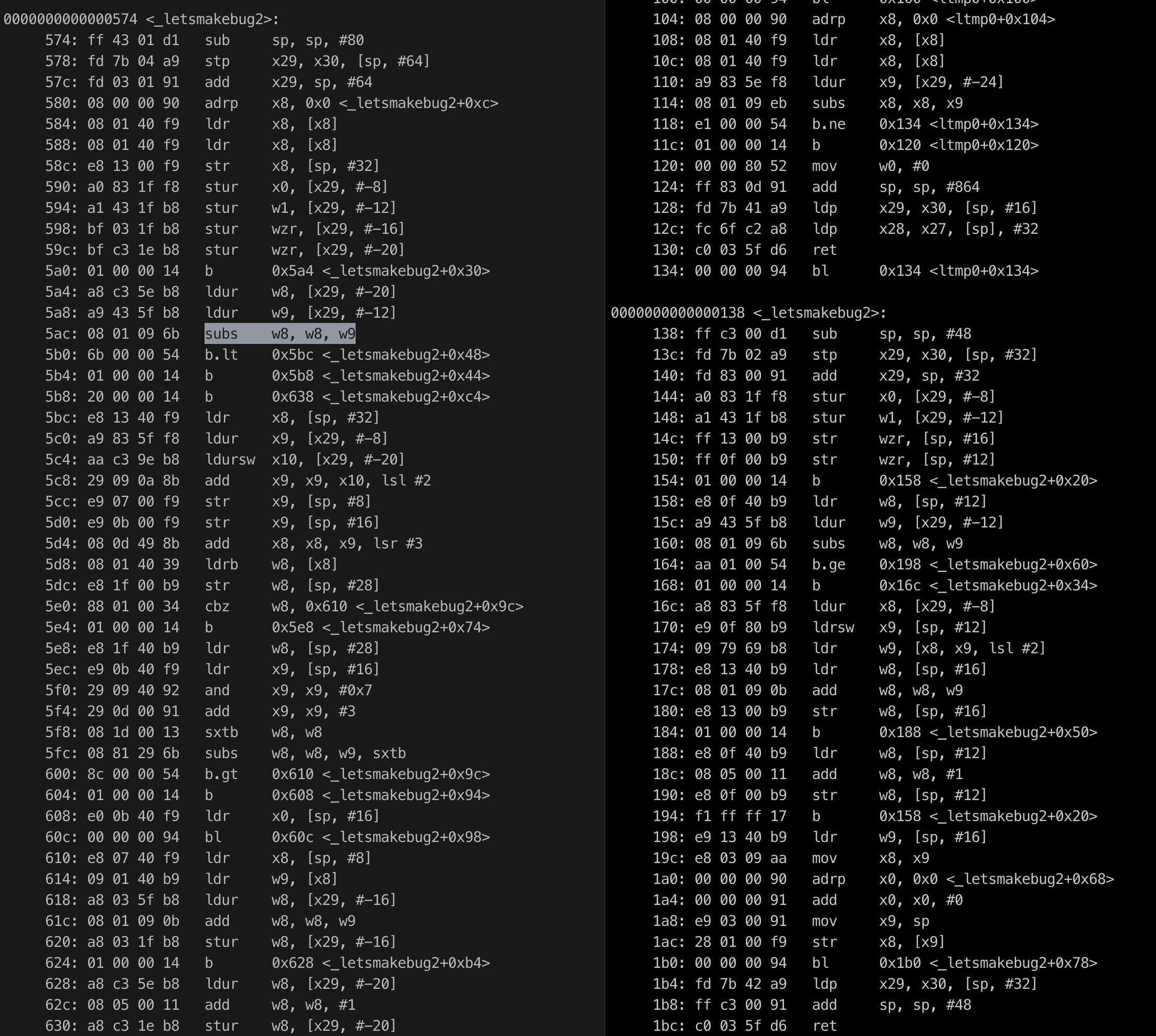실제로 만들어진 코드를 보면 뭔가 덕지덕지 많이 붙어있습니다. 하지만 제가 잘 몰라서 구체적으로 어떤 방식으로 오류가 발생하게 되는지는 이것만으로는 알기 힘드네요 😅 JMP(B, BL)에 해당되는 눈에 띄는 코드는 그렇게 많이 보이지 않으나 SUBS와 같은 특수 명령어들이 눈에 띕니다. 아마 0x5e8 이 검사 로직이 아닐까...