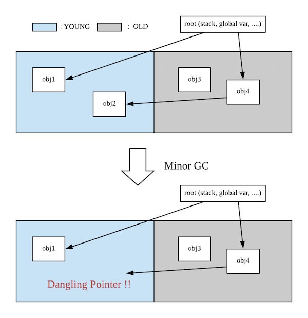 YG/OG를 따로 분리하여 세대별로 GC를 수행한다는 발상까지는 좋았으나, 위 그림처럼 YG GC(=Minor GC)를 수행하게 되면 Dangling pointer이 생길 수 있습니다. 이 때문에 OG가 참조하는 경우 Write barrier을 켜게 되고, 뭐 Card table에 기록을 하게 되고 확인을 하게 되고 어쩌구저쩌구... 아무튼 복잡합니다! Go 개발자들은 복잡한 걸 무척이나 싫어합니다. 복잡하면서 오버헤드까지 있는 걸 견디지 못해서 빼버리기로 합니다.