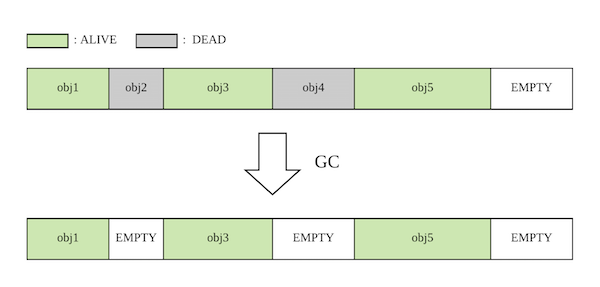 메모리 컴팩션은 메모리 단편화를 막기 위해 메모리를 재배치하는 과정입니다. 아마 GC중에서 제일 비싼 비용 중 하나일 겁니다. 그런데, Go는 과감하게 이를 포기했습니다. 그래서, 아래와 같이 GC를 하게 되면 파편화 된 흔적이 그대로 남습니다.