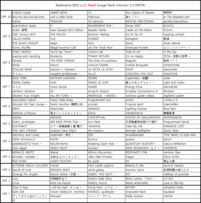 사실 서열표 목적 자체가 고렙 곡들의 난이도 변별력을 키우기 위함인 것을 부정할 수는 없습니다. 다만 그러한 특성 때문에 11렙 이하의 서열표는 거의 없다시피한 실정이고, 애매한 레벨대(9~10레벨) 유저들은 참조할 만한 자료가 없는 게 문제입니다. 이미 몇번 만들어 줄 수 없냐는 요청을 받기도 했었습니다.