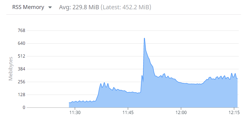 덕분에 5GiB의 끔찍했던 메모리 사용량에서 상당히 줄였지만, 여전히 1GiB 스파이크 사용량은 너무 많았습니다.