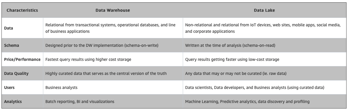 다만 아래에서 언급하겠지만, 적당히 잘 정제된 형태로 데이터 레이크에 저장된 파일은 (e.g. csv, json), 바로 데이터 웨어하우스로 쓰일 수도 있다. 결국 사용하는 툴이나 의도에 따라 데이터 웨어하우스이냐 레이크냐가 갈리는 거지, 아주 엄밀한 구분 기준은 없음.