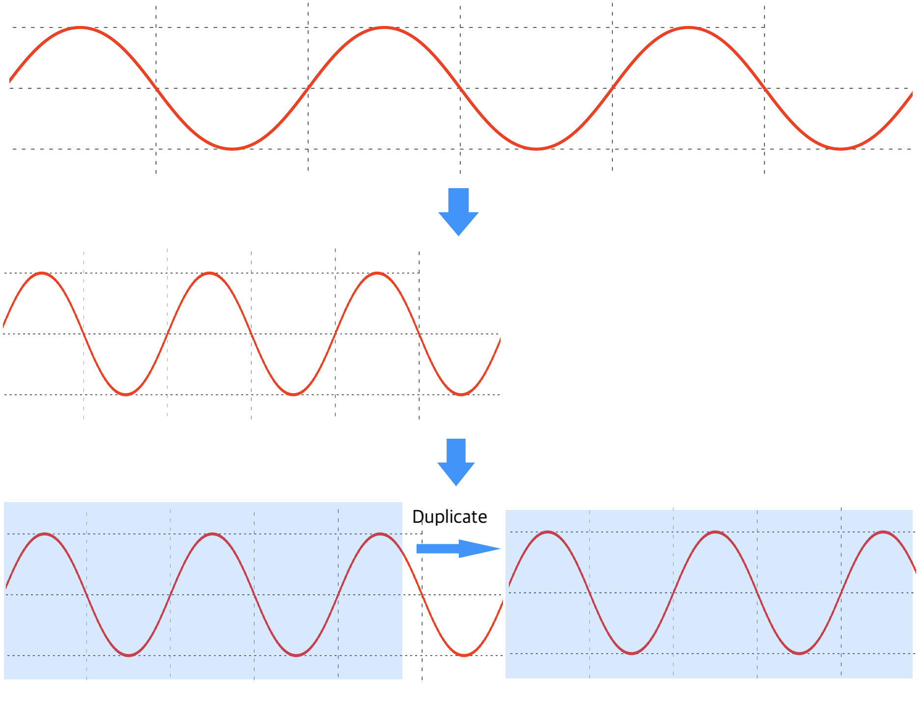접근 방법이야 다양하겠지만, 대충 이런 느낌으로 Strectch(resample) 후 Window 패턴을 복제해서 길이를 맞추어 속도를 유지할 수 있습니다.