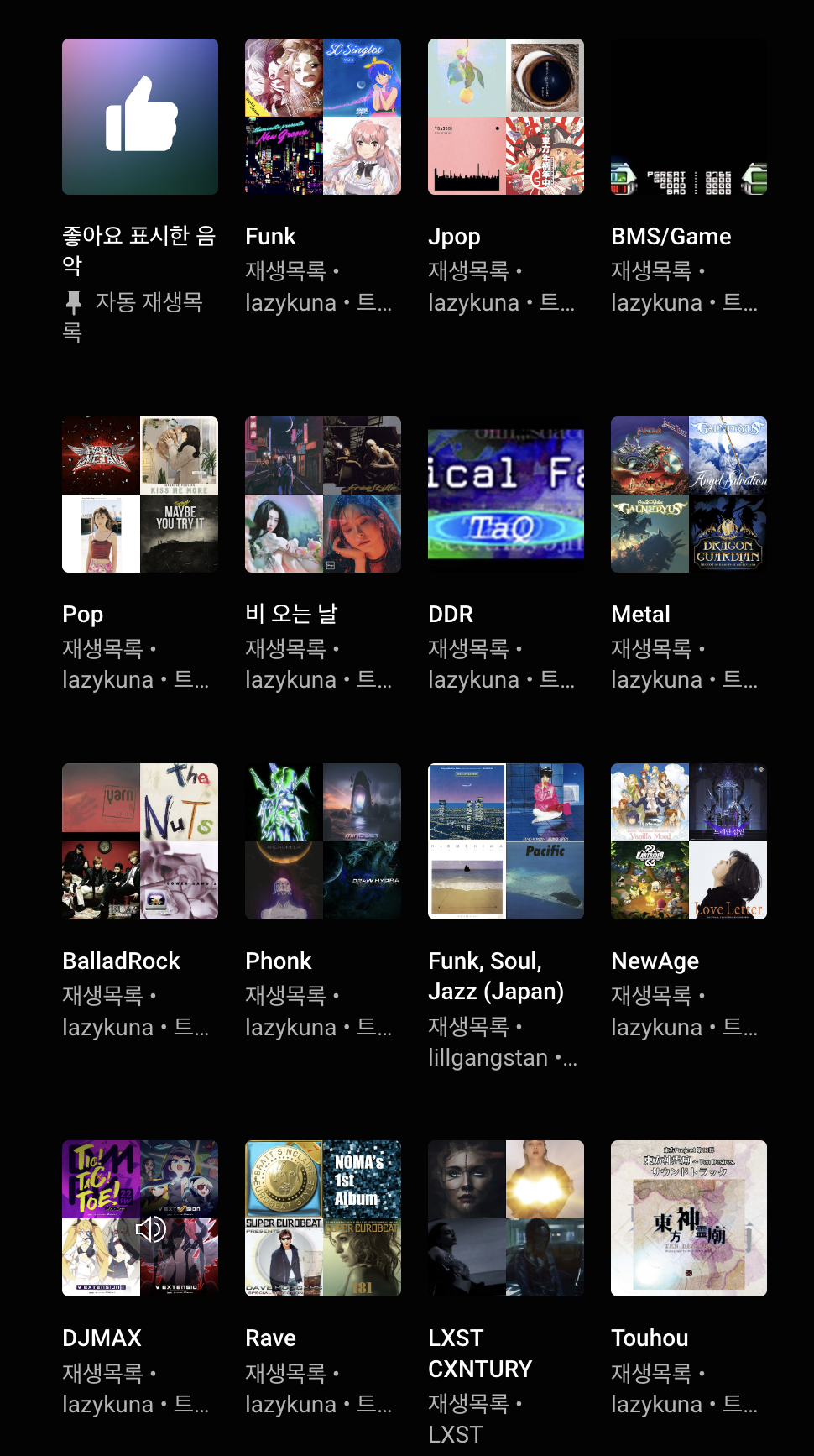 90’s Funk, 발라드락, Metal, Phonk, 리듬게임 등으로 분류해 놨더니 꽤 들을만 하네요. 덤으로 이 리스트를 기반으로 음악 자동추천을 받으니 훨씬 취향의 곡이 많이 들어옵니다.